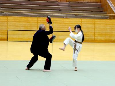 蹴蹴りを行いました。中段を蹴った後瞬時に蹴り足を引き上段